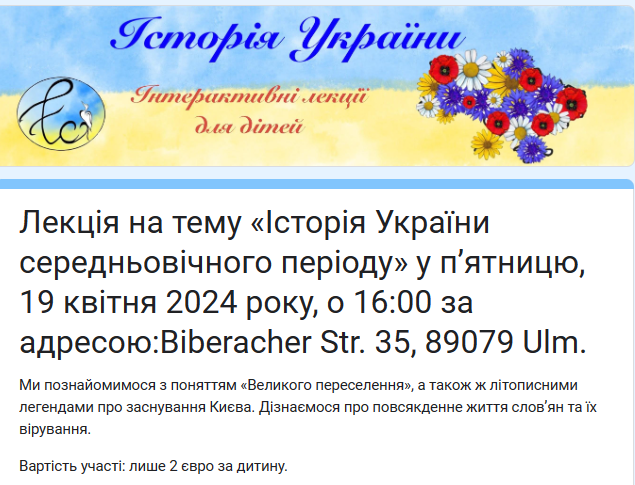 Запрошуємо дітей віком від 9 до 14 років на першу інтерактивну лекцію з циклу про історію нашої країни на тему: „Україна у Середньовіччі“. Лекція відбудеться в п’ятницю, 19 квітня 2024 року, о 16:00 за адресою: Biberacher Str. 35, 89079 Ulm. Цей цикл лекцій розглядає історію України, починаючи з періодизації та початку середньовічного періоду. Ми дослідимо поняття „Великого переселення“, розглянемо літописні легенди про заснування Києва та дізнаємося про повсякденне життя словʼян та їх вірування. Вартість участі: лише 2 євро за дитину. Попередня реєстрація обов’язкова! Дата та час: П’ятниця, 19 квітня 2024 року, о 16:00.